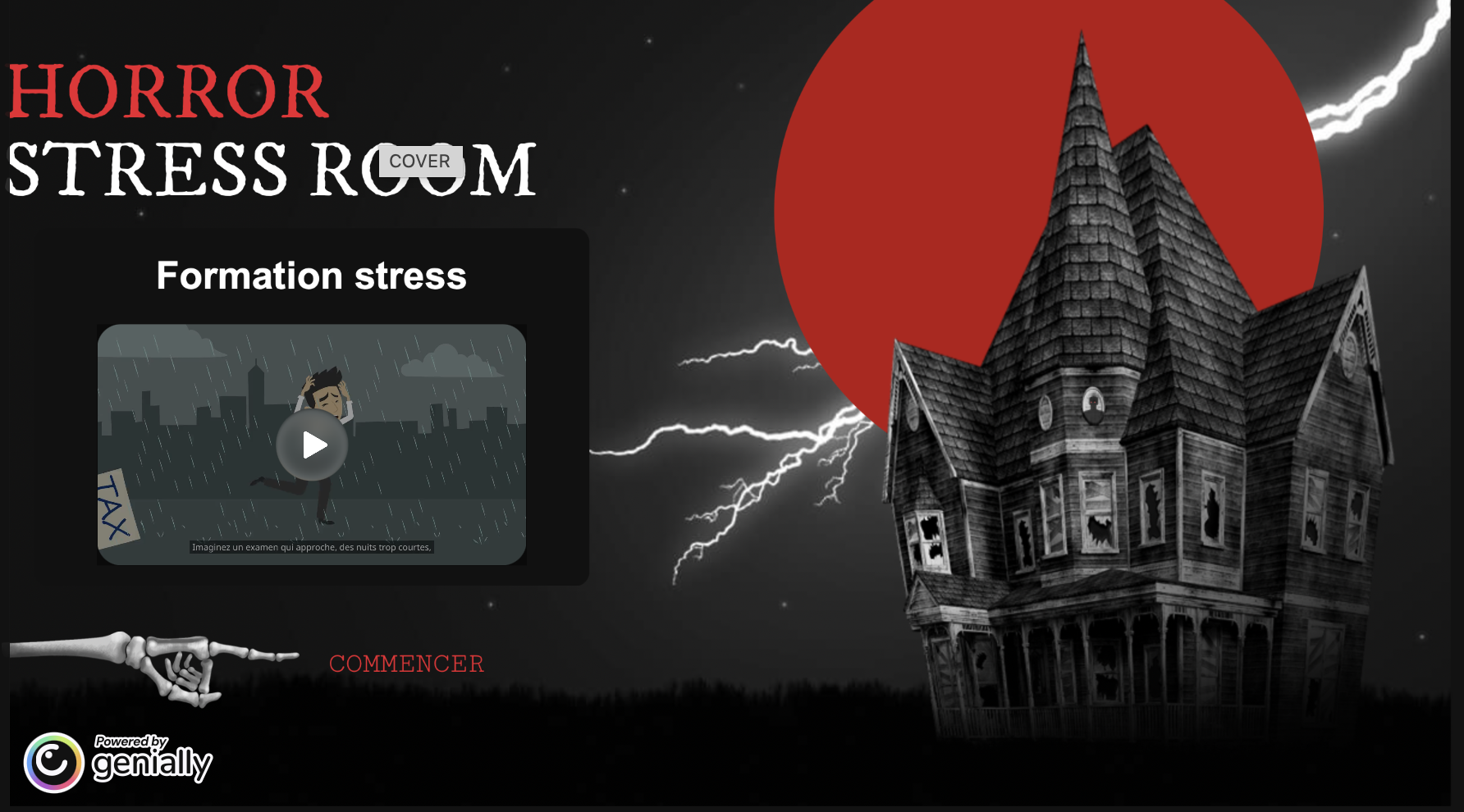 Porté sur la gestion du stress en situation d'examen, ce cours est développé sous forme d'escape game. L'apprenant doit résoudre différents mystères durant le jeu en lisant ou regardant des ressources. Ces mystères lui permettent de trouver des indices afin de résoudre les problèmes auxquels il est confronté.